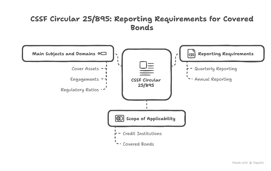 CSSF Circular 25/895, dated July 31, 2025, defines the format and procedures for credit institutions under Luxembourg law to report on their lettres de gage (covered bonds). In application of the 2021 law on covered bonds, it requires regular reporting to the CSSF. Institutions must submit quarterly data using specific Excel templates, detailing cover assets, liabilities, and key coverage ratios. Additionally, an annual free-form PDF report is required. The circular specifies reporting deadlines aligned with COREP/FINREP and details the file-naming conventions and submission process.